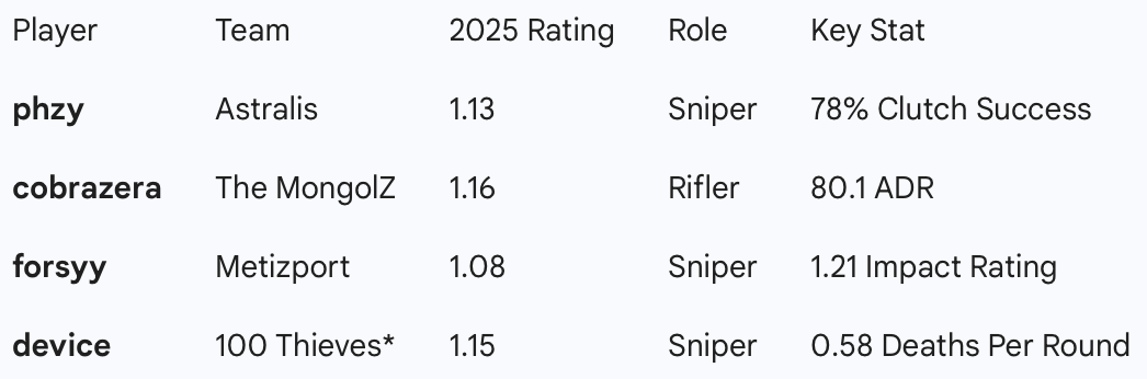 phzy arrives via a buyout from 9INE and steps into one of the heaviest roles in Counter-Strike history. Stat-wise, he’s earned the shot. During 2025, phzy posted a 1.13 rating across 167 maps, ranking among the top seven AWPers globally against Top 20 teams.